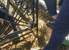 Предварительно убрав уже выросшие сорняки, мы привариваем к ножкам ограждения металлическую полосу. Она обозначает периметр участка и препятствует высыпанию крошки за его пределы.