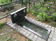 Горизонтальный памятник из гранита от времени немного покосился. Клиент заказал нам его восстановление, а также покраску ограждения.